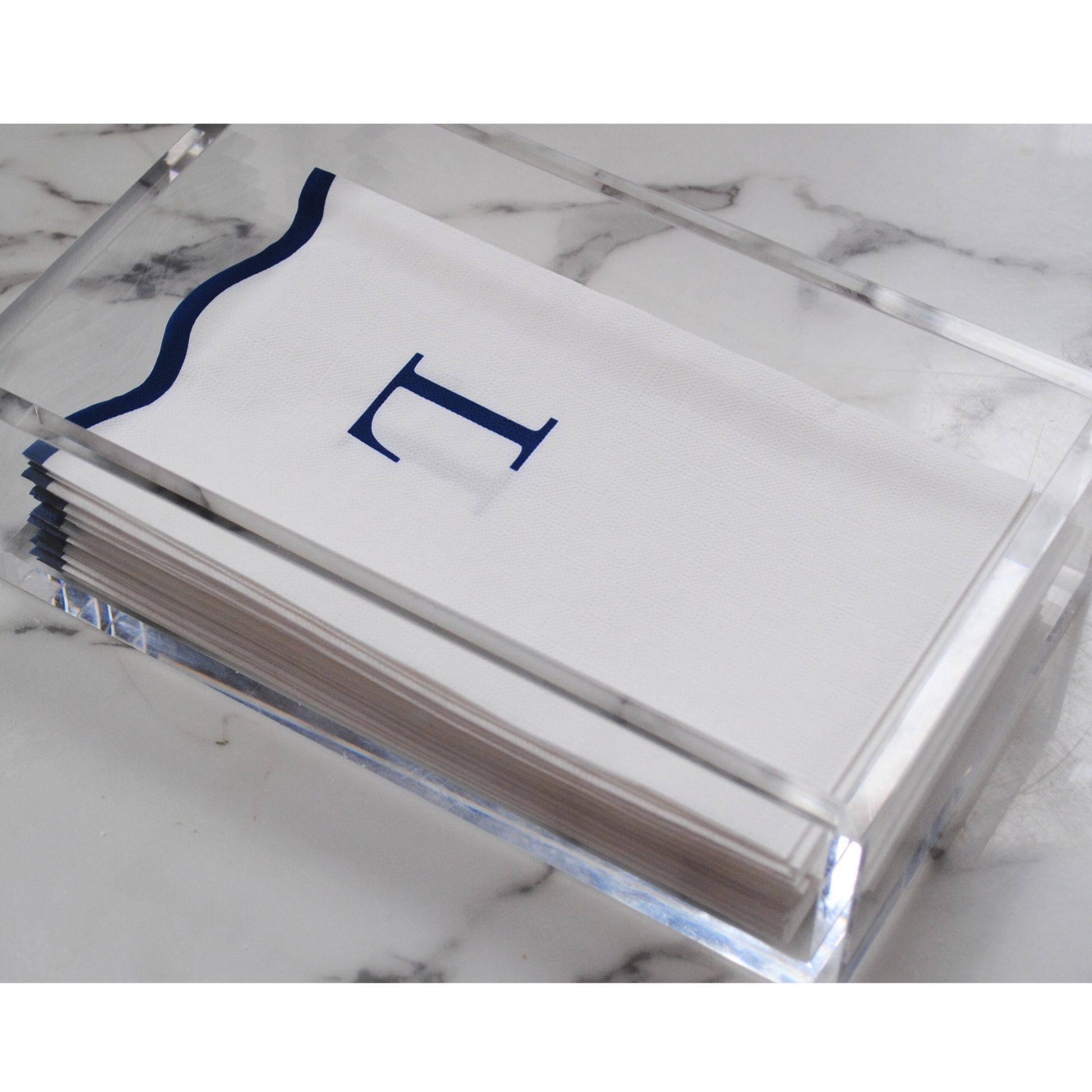 Printed with a royal navy-blue scalloped edge and a letter "L"